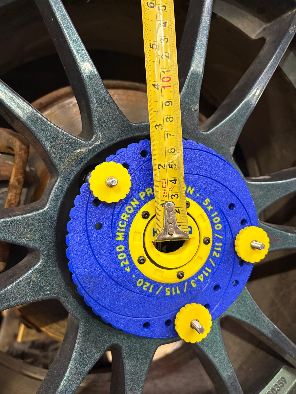 With the help of good old fashioned trigonometry, we exploit 3 points on the PCD to find this center. This provides a sound foundation to accurately and reliably measure to a cars body.