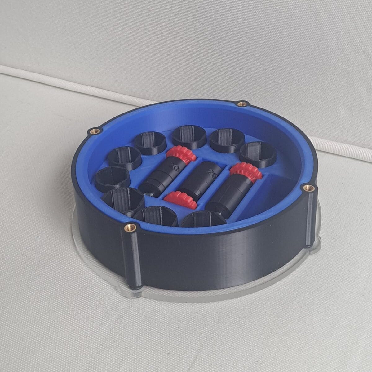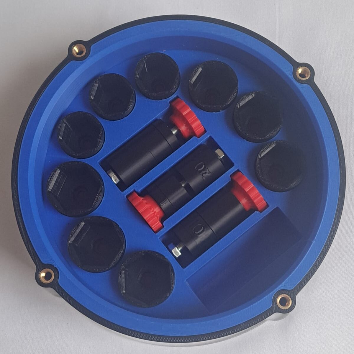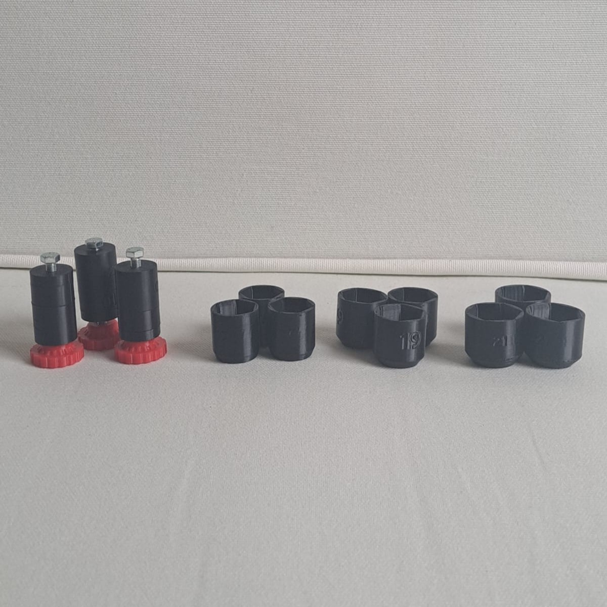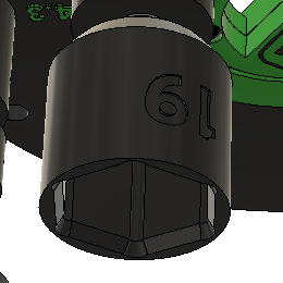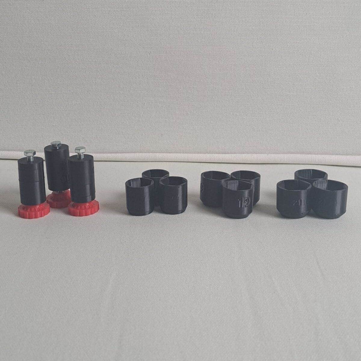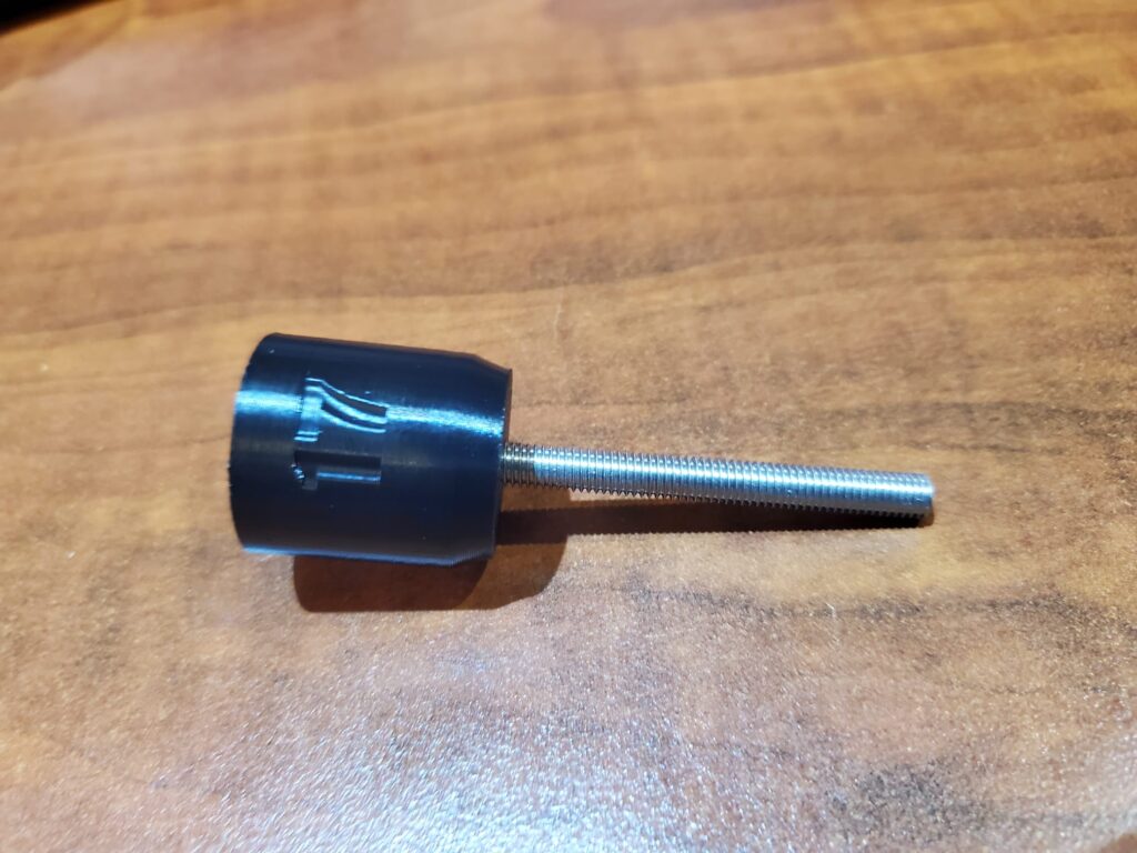 After selecting 3 of the appropriately sized hex socket attachments, slide the 45 mm bolt through the open face of the socket so the bolt head securely fits into the recessed cavity at back of the socket.