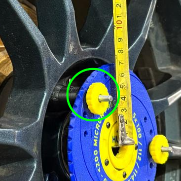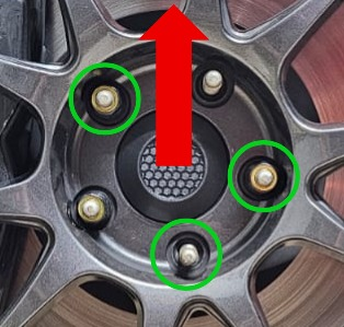 Select 3 lug nuts which provide the clearest vertical path to the fender (Green). Try not to use the upper most point which may obstruct your tape measure (Red).